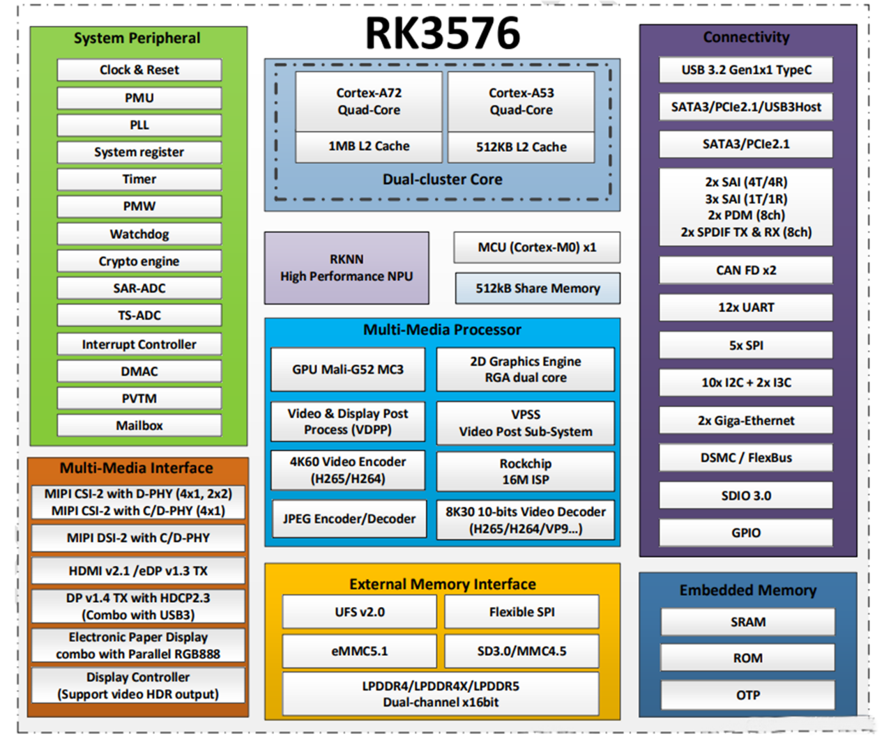 Rockchip RK3576 2 세대 8nm 고성능 AIOT 플랫폼은 ARM 기반 PC, 에지 컴퓨팅 장치 및 개인 모바일 인터넷 장치와 같은 다양한 응용 프로그램 시나리오에 적합한 고성능 저전력 SOC (시스템 온 칩) 프로세서입니다. ARM 아키텍처를 기반으로 8 개의 코어 CPU를 사용하고 독립적 인 6TOP (초당 Tera 작업) NPU (신경망 쿼드 프로세싱 장치)를 통합하고 GPU, MCU, VPU와 같은 여러 컴퓨팅 코어를 통합하여 ALOT의 복잡한 장면 요구 사항을 충족시키기 위해 풍부한 주변 장치 인터페이스를 통합합니다. 또한 RK3576은 UFS (Universal Flash Storage) 스토리지를 지원하여 효율적인 데이터 저장 및 읽기 기능을 제공합니다.