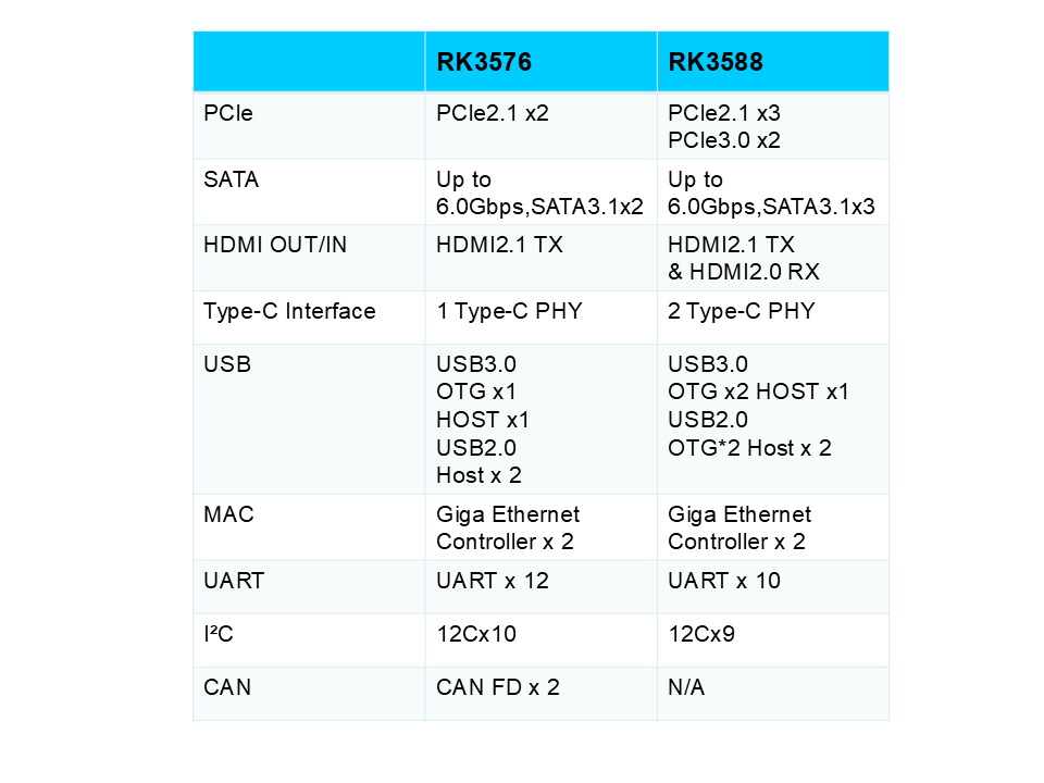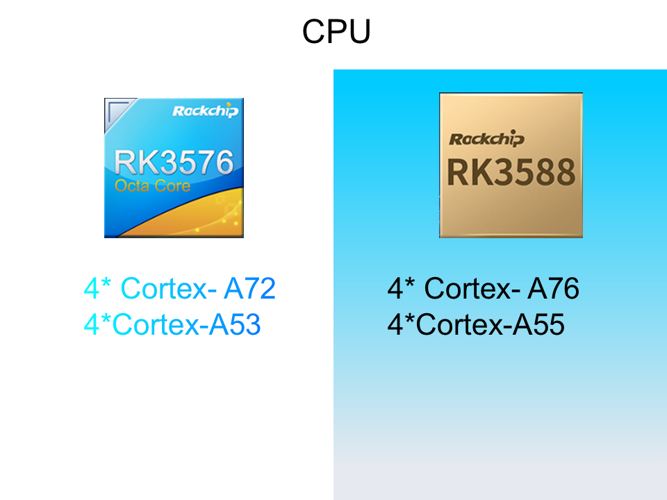 CPU 성능 : RK3588은 쿼드 코어 Cortex-A76 + 쿼드 코어 Cortex-A55를 사용하는 반면 RK3576은 쿼드 코어 Cortexa72 + 쿼드 코어 Cortex-A53 Architecture를 사용하여 비용 고려 사항을 사용하며 ARM Cortex M0 Coprocessor가 장착되어있어 관련 응용 분야에 더 많은 소유권을 제공합니다.