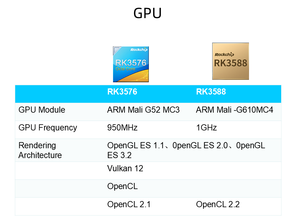 둘 다 OpenGl ES 1.1, 2.0 및 3.2, Vulkan 1.2, RK3588은 OpenCL 버전에서 더 높습니다 (RK3588은 2.2를 지원합니다).