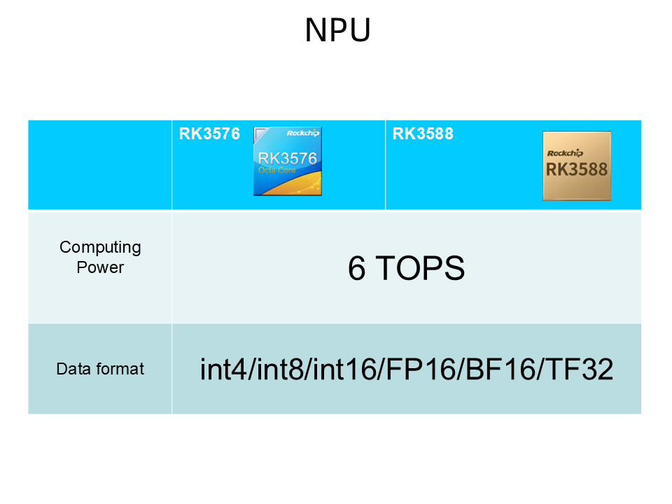 RK3588 및 RK3576은 6TOPS 컴퓨팅 전력, INT4INT8/int16/fp16/bf16/tf32와 같은 데이터 형식을 지원하며 다양한 AI 애플리케이션에 적합합니다. 시나리오.