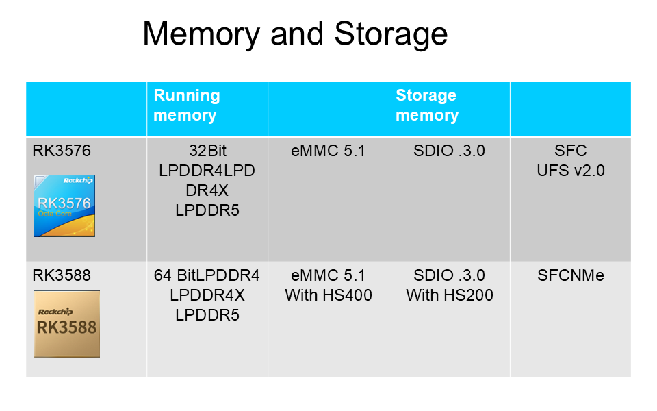 RK3588 지원64 비트LPDDR4/LPDDR4X/LPDDR5, EMMC5.1 : HS400, HS200 및 NME 및 SFC와 함께. 두 사람은 메모리 데이터 비트 너비 (64 비트 대 32 비트)에서 다릅니다.