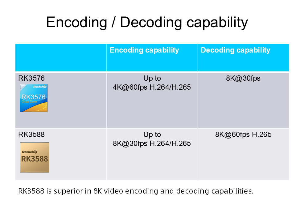 RK3588은 최대 8k@60fps H.265를 지원하며 RK3576은 최대 8K@30fps를 지원합니다.