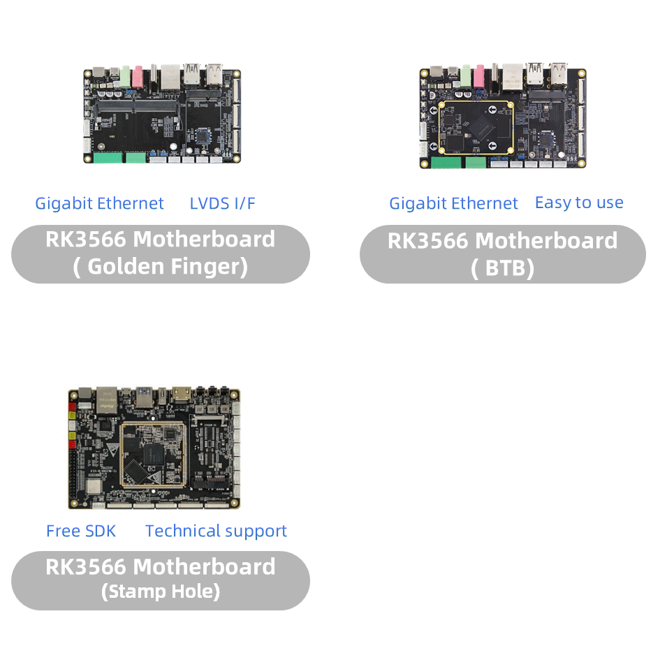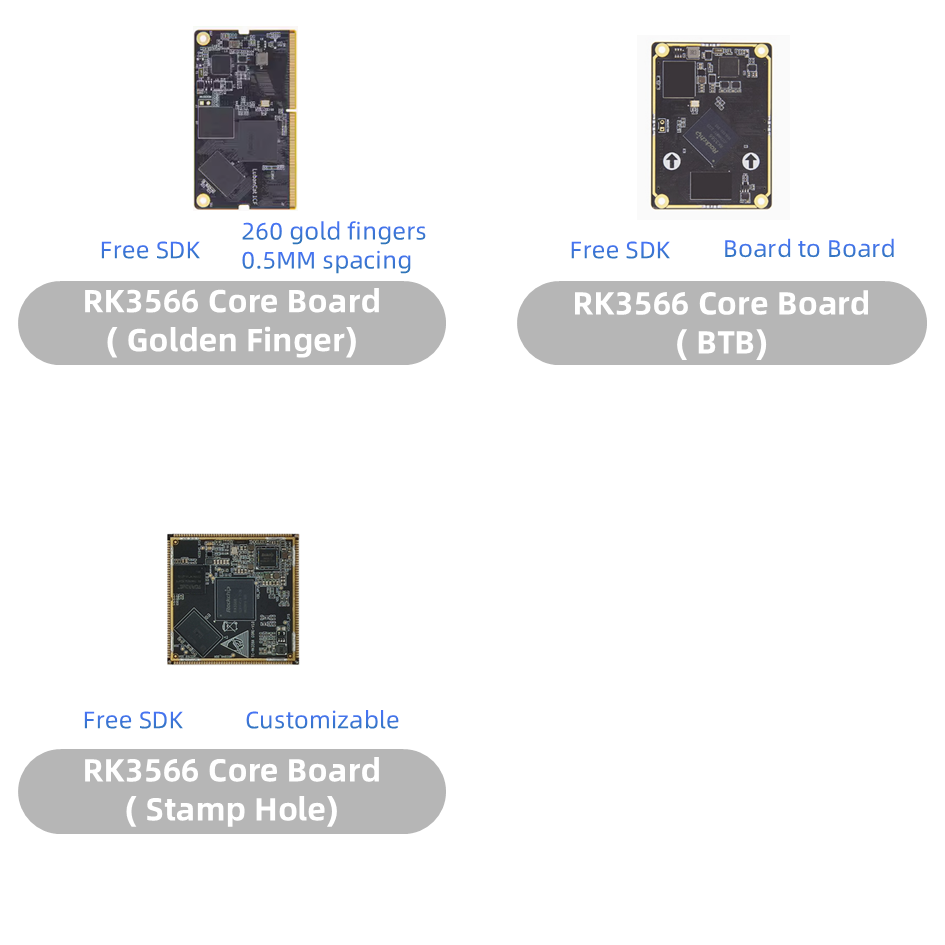 우리는 3 가지 다른 핵심 보드를 개발했습니다. RK3566 스탬프 홀 코어 보드, RK3566 골든 핑거 (SMARC와 유사) 코어 보드 및 RK3566 BTB (보드 투 보드) 코어 보드.